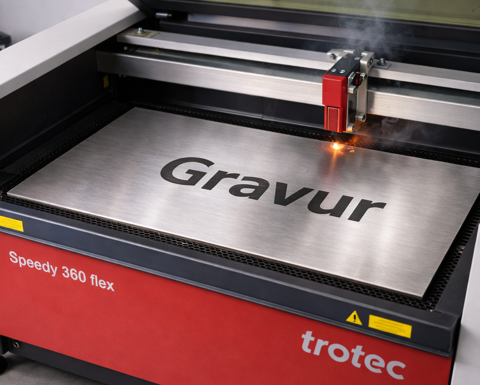 Optik: Sehr feine, gleichmäßige und kontrastreiche Gravuren mit sauberer Kantenführung – ideal für detailreiche Beschriftungen und Grafiken.
